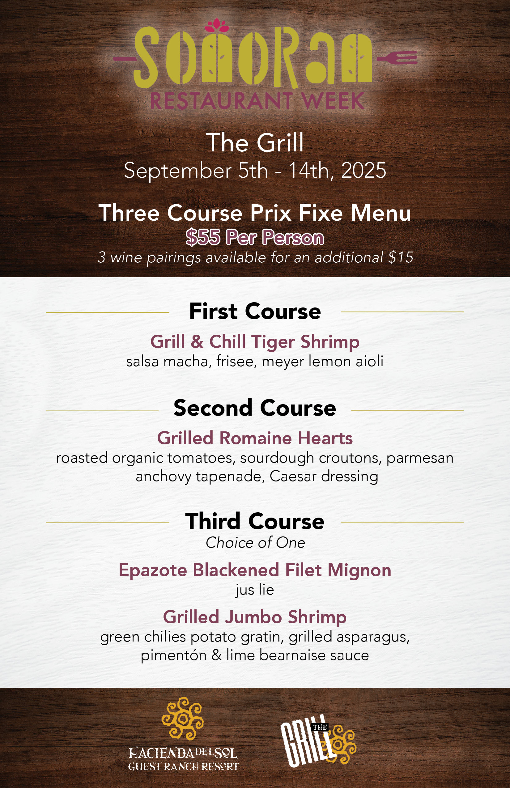 The Grill at Hacienda del Sol, a AAA Four Diamond and Wine Spectator award-winning restaurant located within a historic desert resort, is celebrated for its scenic views and elegant ambiance. Executive Chef Ramon Delgado crafts a refined menu of Southwestern-inspired New American cuisine, using fresh, local ingredients, including herbs from the resort's own organic gardens.